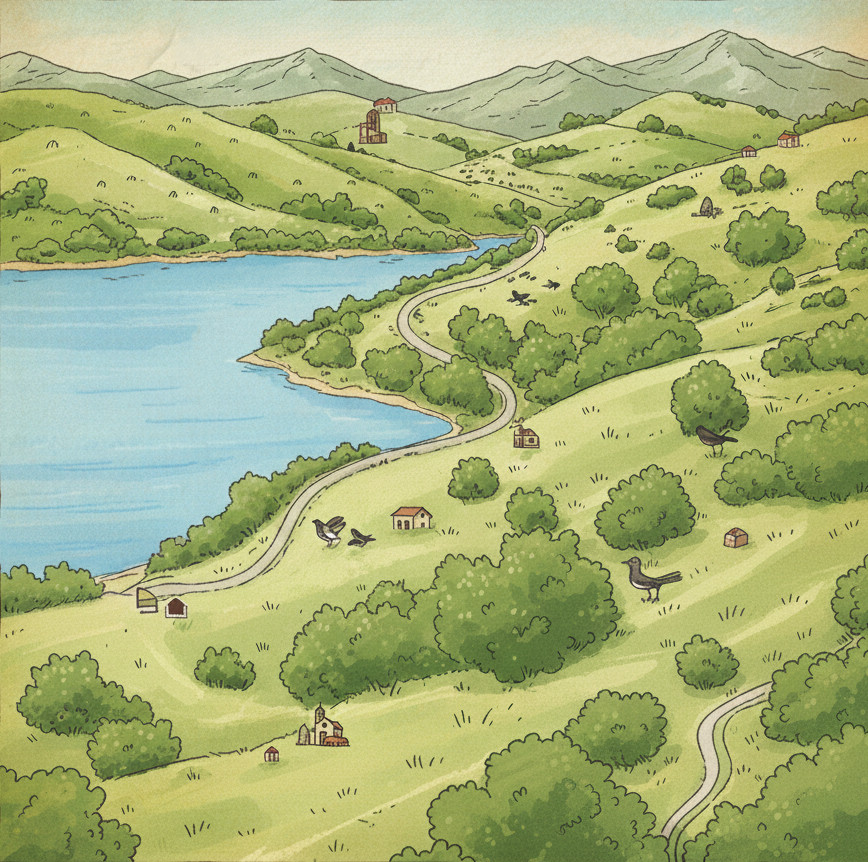 Una camminata comoda e rilassante lungo una strada secondaria e poco frequentata. Partendo da Piazza Dario Conti, si cammina in discesa (lungo un tratto del GAS) con una splendida vista sul Lago a sinistra e il tipico paesaggio collinare a destra. L'ambiente è ricco di siepi naturali e arbusti come la rosa canina e il ginepro, ideali per l'osservazione degli uccelli. L'itinerario giunge al borgo di Meriggio (Acquacanina), dove si trova l'Abbazia di S. Maria di Rio Sacro. Il Ritorno avviene lungo lo stesso itinerario.